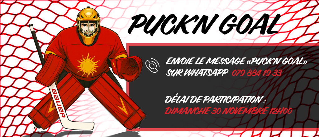 📲 Envoie « Puck’n Goal » sur WhatsApp au 079 884 19 33 avant dimanche 12h00.🎁 À gagner : un abonnement debout pour la saison 2026/27 !